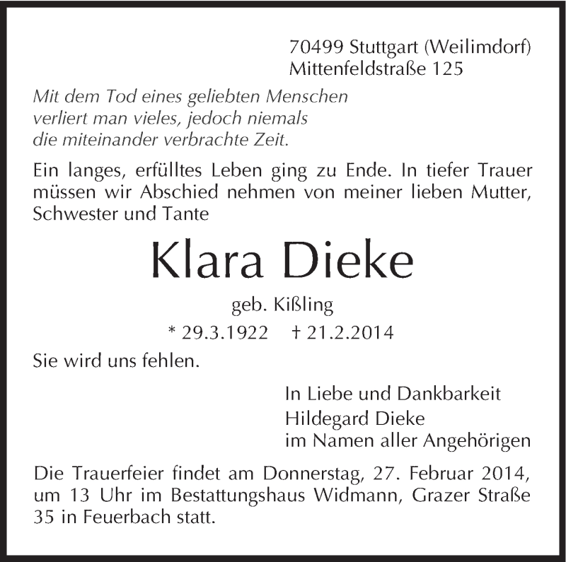 Hier finden Sie alle Traueranzeigen aus der Zeitung, die bisher für Klara Dieke erschienen sind. Weitere Traueranzeigen, die in der Zeitung erscheinen, werden hier ebenfalls aufgelistet