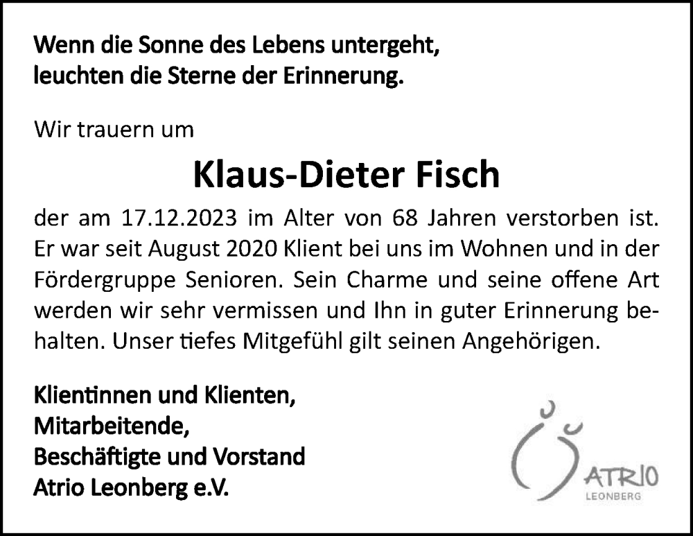 Hier finden Sie alle Traueranzeigen aus der Zeitung, die bisher für Klaus-Dieter Fisch erschienen sind. Weitere Traueranzeigen, die in der Zeitung erscheinen, werden hier ebenfalls aufgelistet