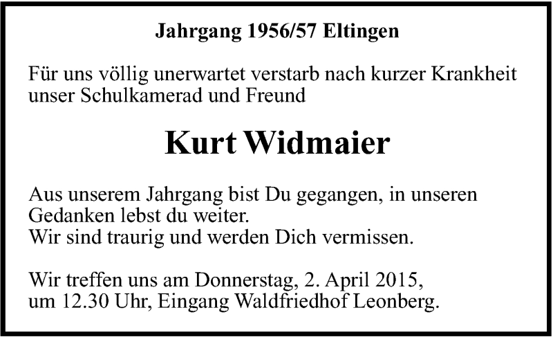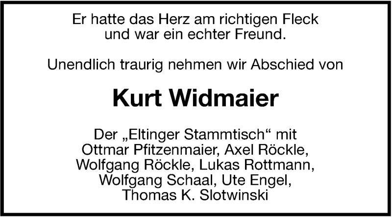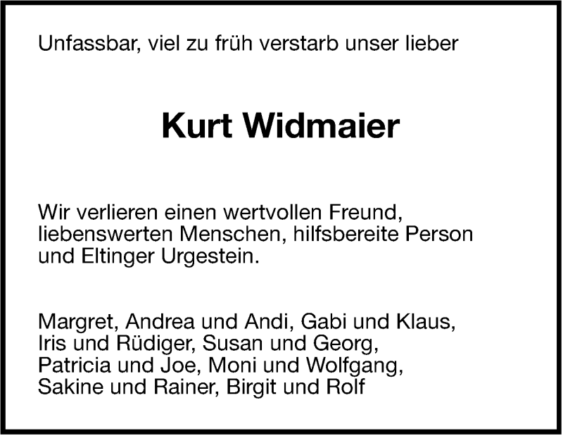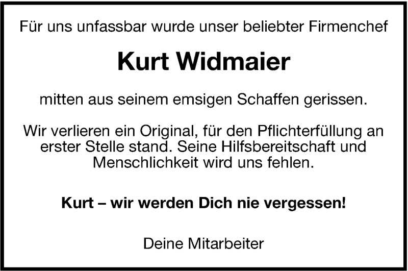 Hier finden Sie alle Traueranzeigen aus der Zeitung, die bisher für Kurt Widmaier erschienen sind. Weitere Traueranzeigen, die in der Zeitung erscheinen, werden hier ebenfalls aufgelistet