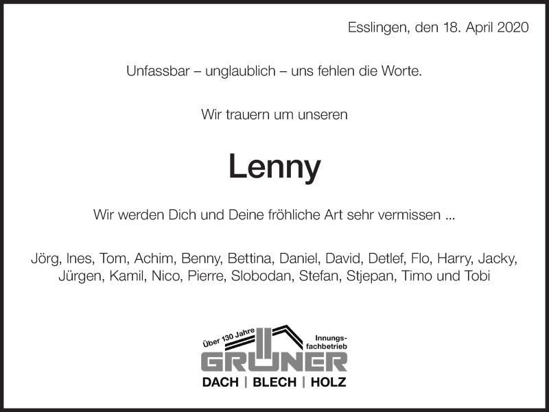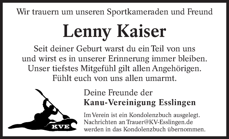 Hier finden Sie alle Traueranzeigen aus der Zeitung, die bisher für Lenny Kaiser erschienen sind. Weitere Traueranzeigen, die in der Zeitung erscheinen, werden hier ebenfalls aufgelistet