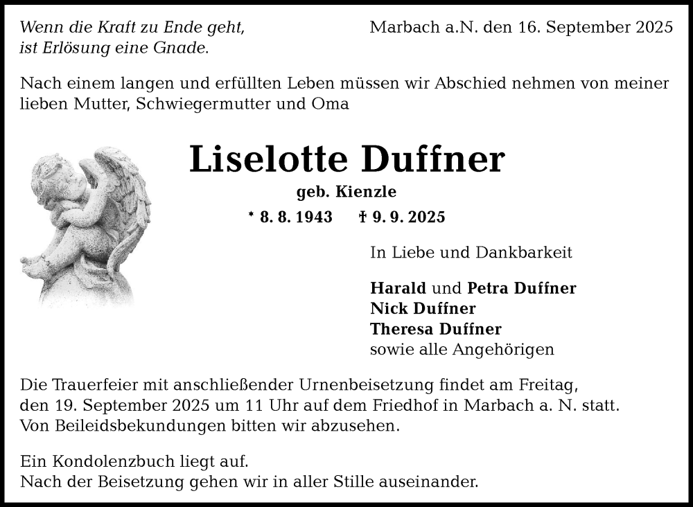 Hier finden Sie alle Traueranzeigen aus der Zeitung, die bisher für Liselotte Duffner erschienen sind. Weitere Traueranzeigen, die in der Zeitung erscheinen, werden hier ebenfalls aufgelistet