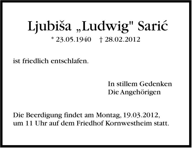 Hier finden Sie alle Traueranzeigen aus der Zeitung, die bisher für Ljubisa Saric erschienen sind. Weitere Traueranzeigen, die in der Zeitung erscheinen, werden hier ebenfalls aufgelistet