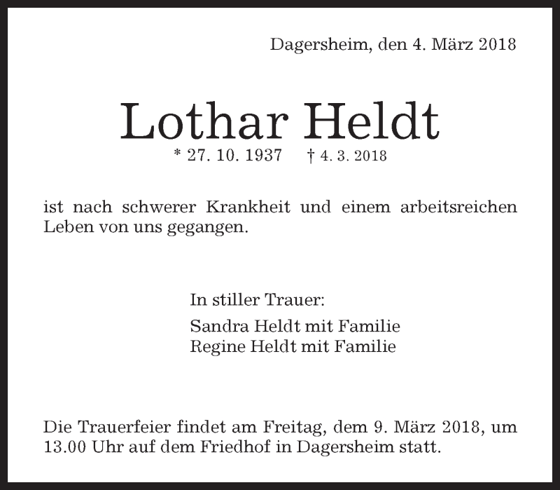Hier finden Sie alle Traueranzeigen aus der Zeitung, die bisher für Lothar Heldt erschienen sind. Weitere Traueranzeigen, die in der Zeitung erscheinen, werden hier ebenfalls aufgelistet