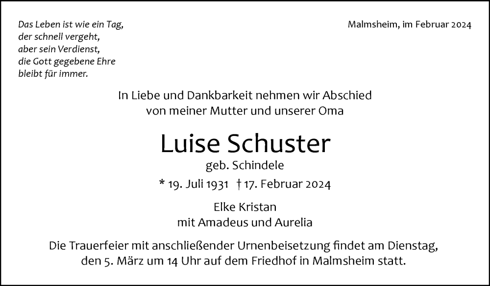 Hier finden Sie alle Traueranzeigen aus der Zeitung, die bisher für Luise Schuster erschienen sind. Weitere Traueranzeigen, die in der Zeitung erscheinen, werden hier ebenfalls aufgelistet