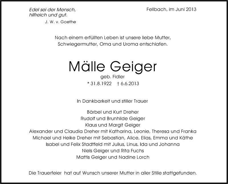 Hier finden Sie alle Traueranzeigen aus der Zeitung, die bisher für Mälle Geiger erschienen sind. Weitere Traueranzeigen, die in der Zeitung erscheinen, werden hier ebenfalls aufgelistet