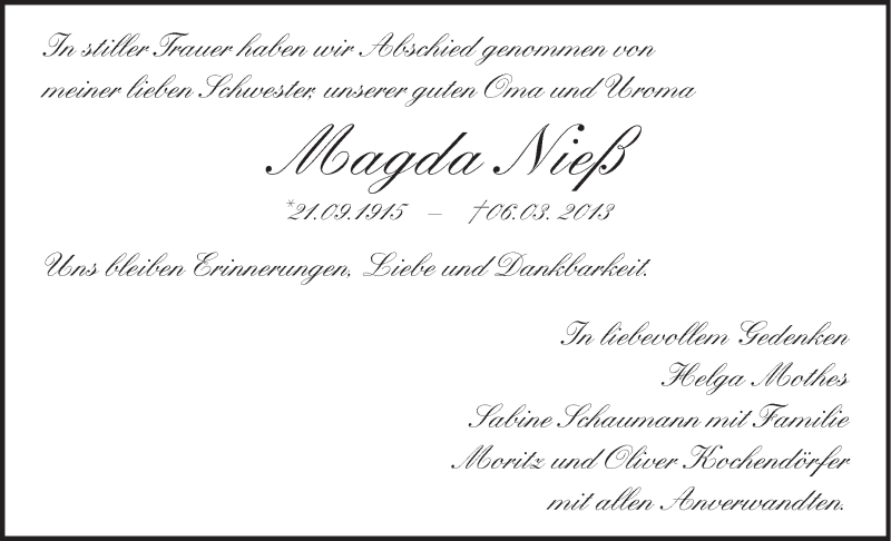 Hier finden Sie alle Traueranzeigen aus der Zeitung, die bisher für Magda Nieß erschienen sind. Weitere Traueranzeigen, die in der Zeitung erscheinen, werden hier ebenfalls aufgelistet