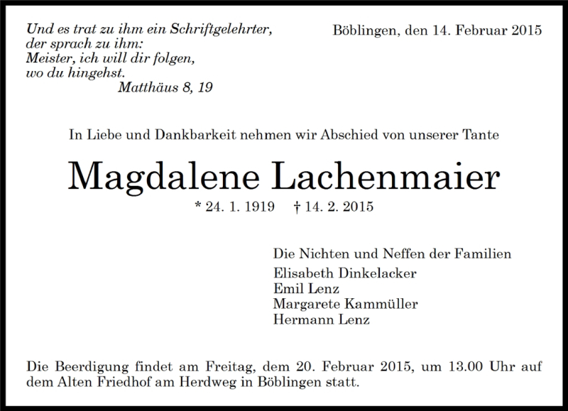 Hier finden Sie alle Traueranzeigen aus der Zeitung, die bisher für Magdalene Lachenmaier erschienen sind. Weitere Traueranzeigen, die in der Zeitung erscheinen, werden hier ebenfalls aufgelistet