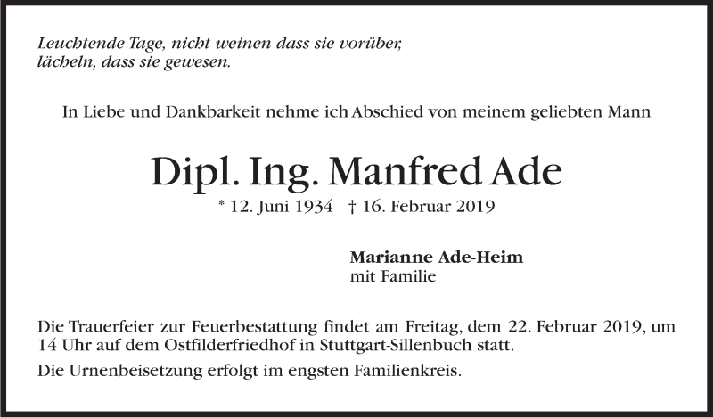 Hier finden Sie alle Traueranzeigen aus der Zeitung, die bisher für Manfred Ade erschienen sind. Weitere Traueranzeigen, die in der Zeitung erscheinen, werden hier ebenfalls aufgelistet