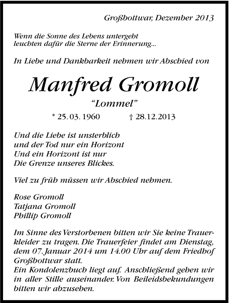 Hier finden Sie alle Traueranzeigen aus der Zeitung, die bisher für Manfred Gromoll erschienen sind. Weitere Traueranzeigen, die in der Zeitung erscheinen, werden hier ebenfalls aufgelistet