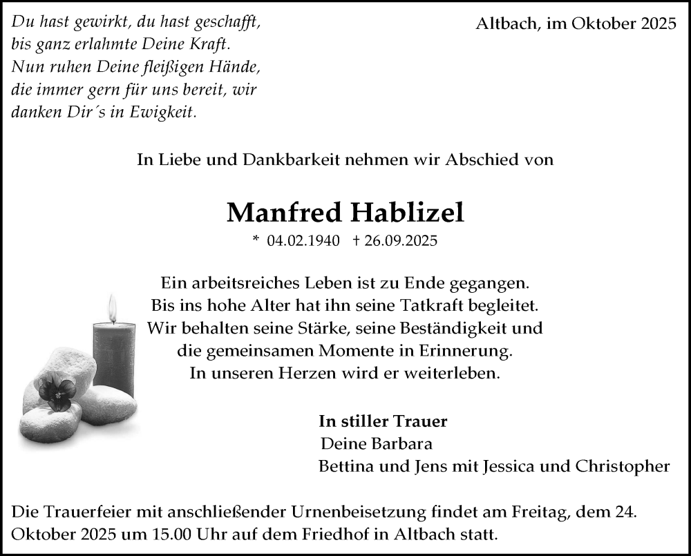 Hier finden Sie alle Traueranzeigen aus der Zeitung, die bisher für Manfred Hablizel erschienen sind. Weitere Traueranzeigen, die in der Zeitung erscheinen, werden hier ebenfalls aufgelistet