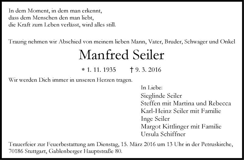 Hier finden Sie alle Traueranzeigen aus der Zeitung, die bisher für Manfred Seiler erschienen sind. Weitere Traueranzeigen, die in der Zeitung erscheinen, werden hier ebenfalls aufgelistet