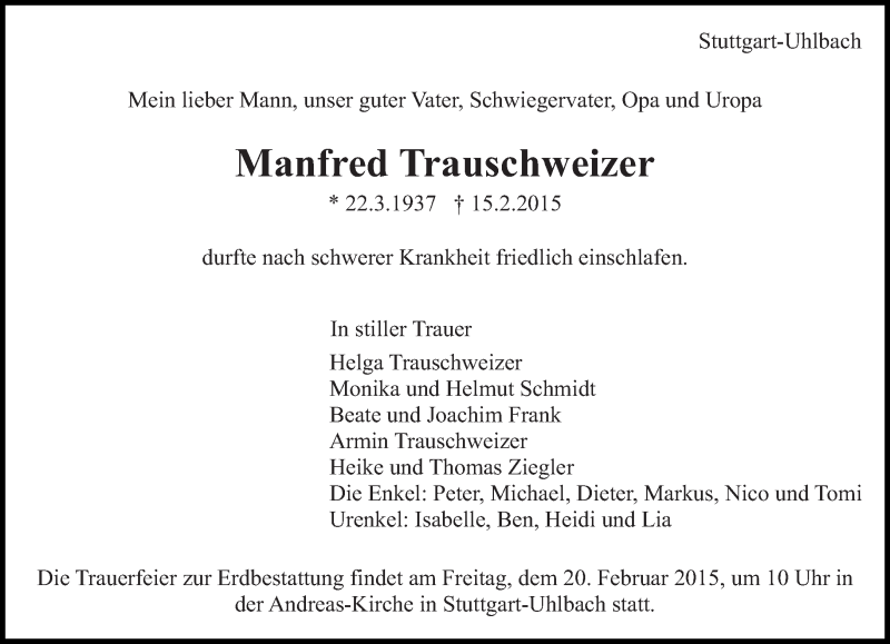 Hier finden Sie alle Traueranzeigen aus der Zeitung, die bisher für Manfred Trauschweizer erschienen sind. Weitere Traueranzeigen, die in der Zeitung erscheinen, werden hier ebenfalls aufgelistet