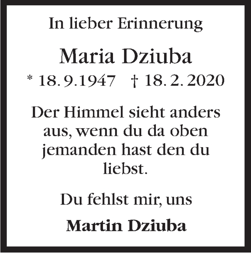 Hier finden Sie alle Traueranzeigen aus der Zeitung, die bisher für Maria Dziuba erschienen sind. Weitere Traueranzeigen, die in der Zeitung erscheinen, werden hier ebenfalls aufgelistet