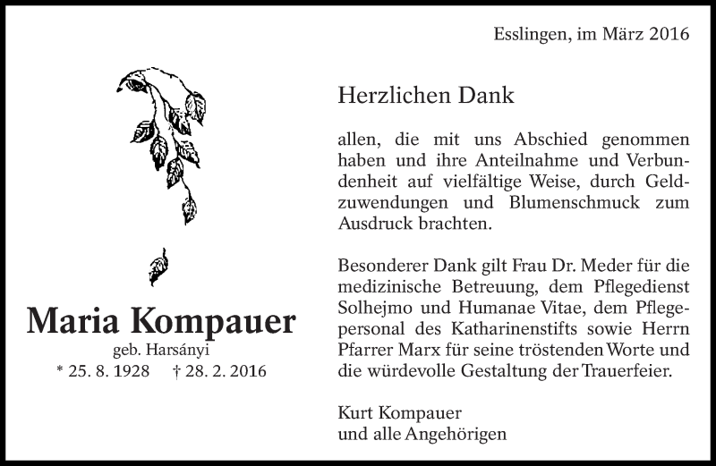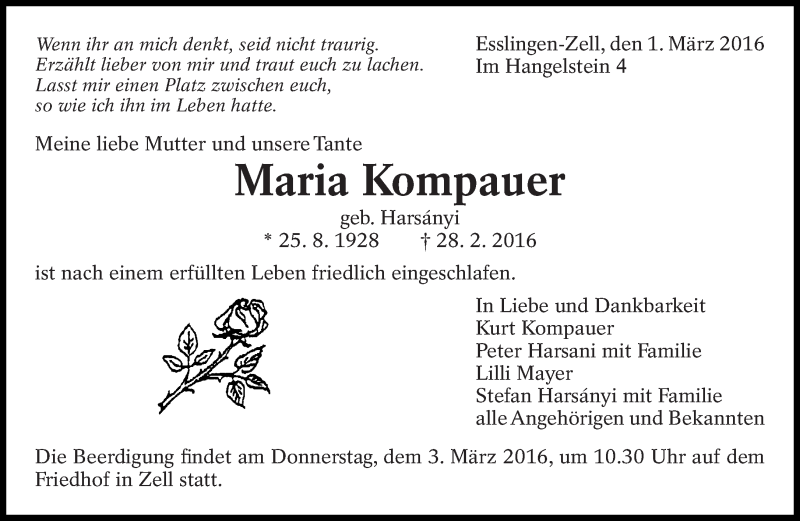 Hier finden Sie alle Traueranzeigen aus der Zeitung, die bisher für Maria Kompauer erschienen sind. Weitere Traueranzeigen, die in der Zeitung erscheinen, werden hier ebenfalls aufgelistet