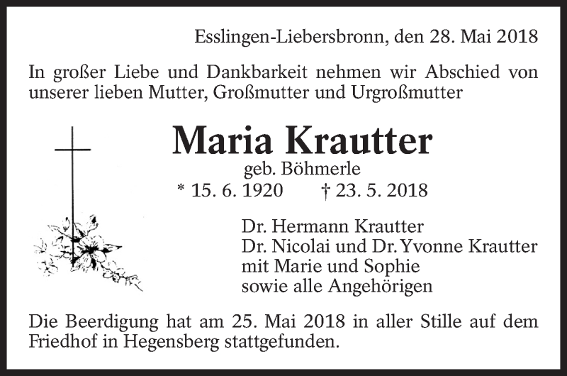 Hier finden Sie alle Traueranzeigen aus der Zeitung, die bisher für Maria Krautter erschienen sind. Weitere Traueranzeigen, die in der Zeitung erscheinen, werden hier ebenfalls aufgelistet