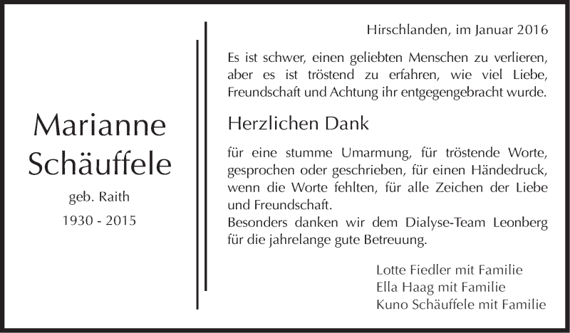 Hier finden Sie alle Traueranzeigen aus der Zeitung, die bisher für Marianne Schäufele erschienen sind. Weitere Traueranzeigen, die in der Zeitung erscheinen, werden hier ebenfalls aufgelistet