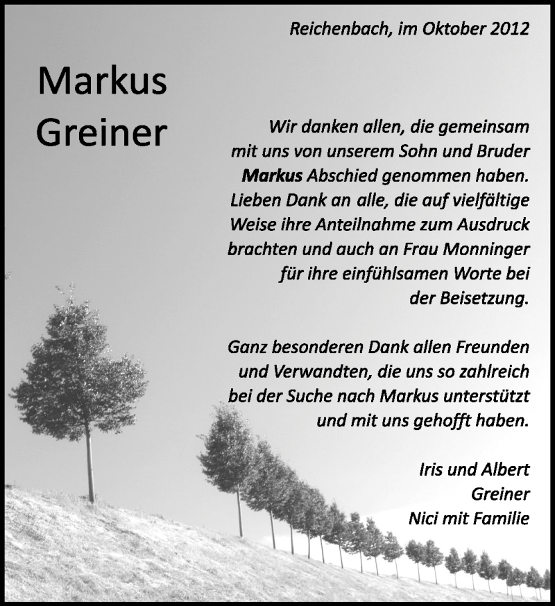 Hier finden Sie alle Traueranzeigen aus der Zeitung, die bisher für Markus Greiner erschienen sind. Weitere Traueranzeigen, die in der Zeitung erscheinen, werden hier ebenfalls aufgelistet
