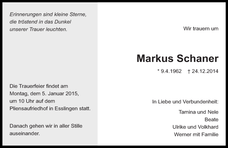 Hier finden Sie alle Traueranzeigen aus der Zeitung, die bisher für Markus Schaner erschienen sind. Weitere Traueranzeigen, die in der Zeitung erscheinen, werden hier ebenfalls aufgelistet