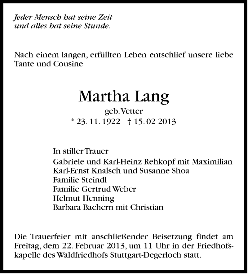 Hier finden Sie alle Traueranzeigen aus der Zeitung, die bisher für Martha Lang erschienen sind. Weitere Traueranzeigen, die in der Zeitung erscheinen, werden hier ebenfalls aufgelistet