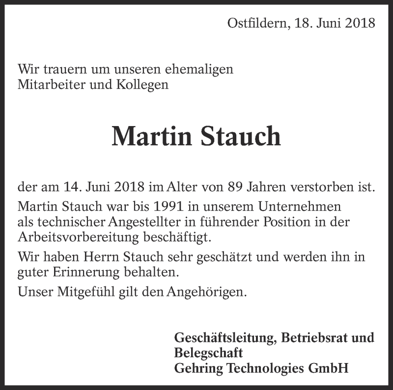 Hier finden Sie alle Traueranzeigen aus der Zeitung, die bisher für Martin Stauch erschienen sind. Weitere Traueranzeigen, die in der Zeitung erscheinen, werden hier ebenfalls aufgelistet