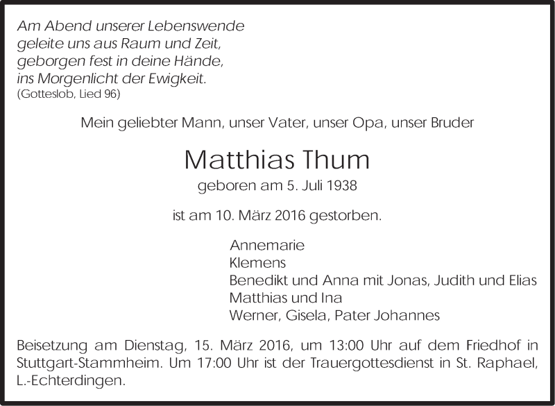 Hier finden Sie alle Traueranzeigen aus der Zeitung, die bisher für Matthias Thum erschienen sind. Weitere Traueranzeigen, die in der Zeitung erscheinen, werden hier ebenfalls aufgelistet