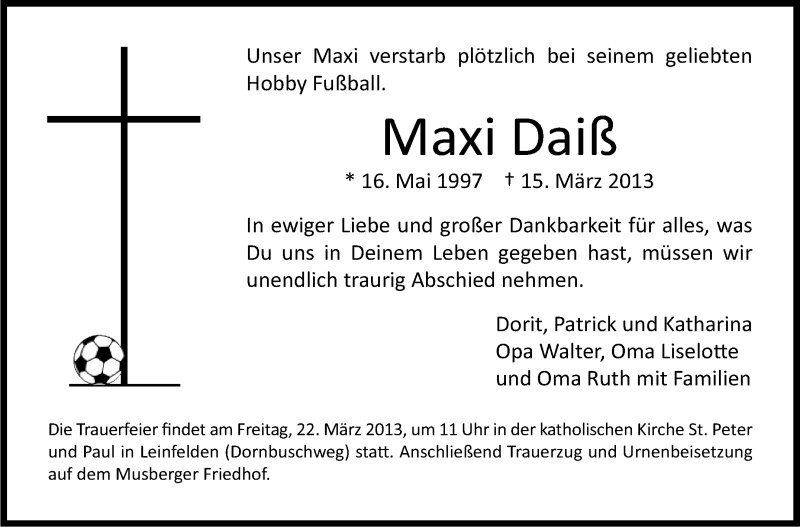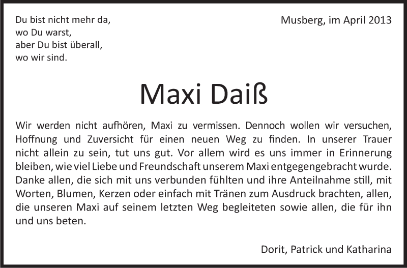 Hier finden Sie alle Traueranzeigen aus der Zeitung, die bisher für Maxi Daiß erschienen sind. Weitere Traueranzeigen, die in der Zeitung erscheinen, werden hier ebenfalls aufgelistet