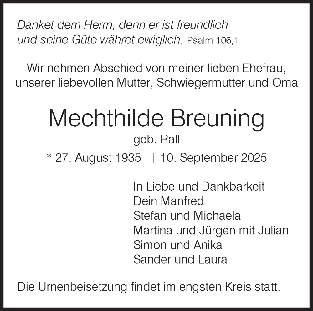Hier finden Sie alle Traueranzeigen aus der Zeitung, die bisher für Mechthilde Breuning erschienen sind. Weitere Traueranzeigen, die in der Zeitung erscheinen, werden hier ebenfalls aufgelistet