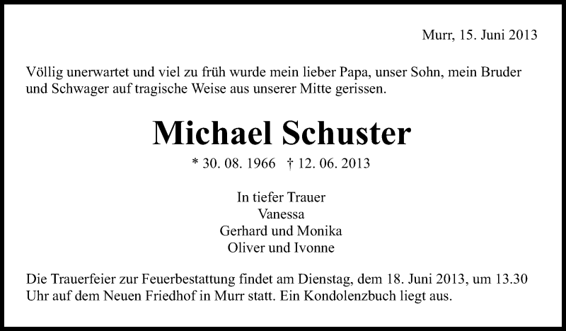 Hier finden Sie alle Traueranzeigen aus der Zeitung, die bisher für Michael Schuster erschienen sind. Weitere Traueranzeigen, die in der Zeitung erscheinen, werden hier ebenfalls aufgelistet