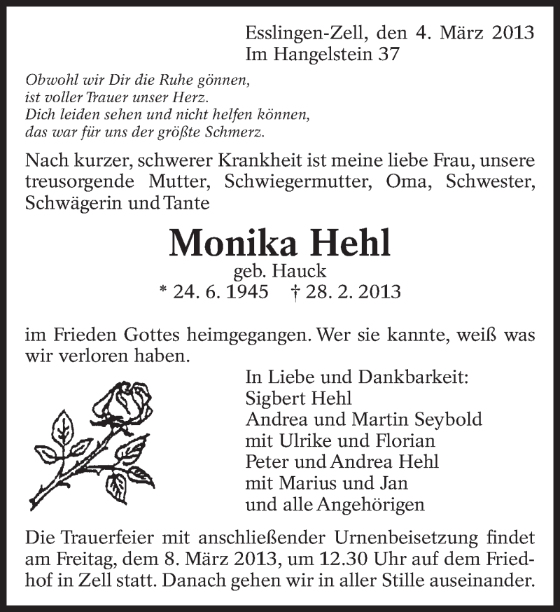 Hier finden Sie alle Traueranzeigen aus der Zeitung, die bisher für Monika Hehl erschienen sind. Weitere Traueranzeigen, die in der Zeitung erscheinen, werden hier ebenfalls aufgelistet