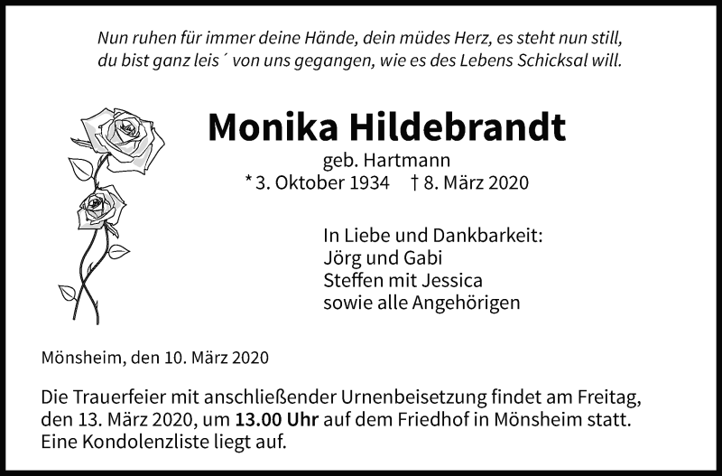 Hier finden Sie alle Traueranzeigen aus der Zeitung, die bisher für Monika Hildebrandt erschienen sind. Weitere Traueranzeigen, die in der Zeitung erscheinen, werden hier ebenfalls aufgelistet