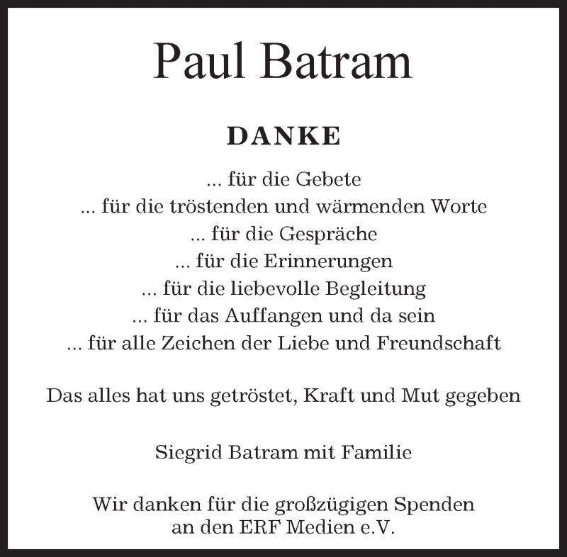 Hier finden Sie alle Traueranzeigen aus der Zeitung, die bisher für Paul Batram erschienen sind. Weitere Traueranzeigen, die in der Zeitung erscheinen, werden hier ebenfalls aufgelistet