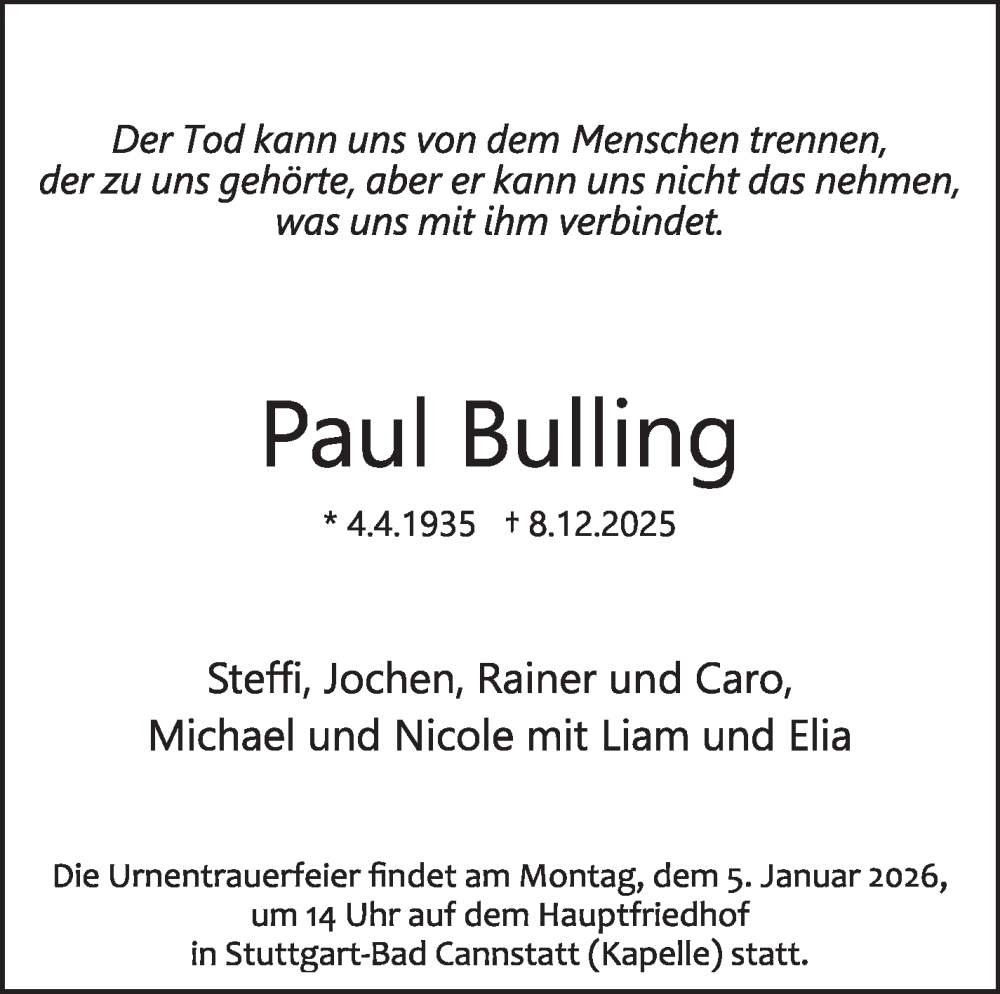 Hier finden Sie alle Traueranzeigen aus der Zeitung, die bisher für Paul Bulling erschienen sind. Weitere Traueranzeigen, die in der Zeitung erscheinen, werden hier ebenfalls aufgelistet