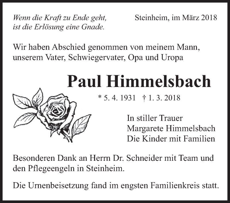 Hier finden Sie alle Traueranzeigen aus der Zeitung, die bisher für Paul Himmelsbach erschienen sind. Weitere Traueranzeigen, die in der Zeitung erscheinen, werden hier ebenfalls aufgelistet