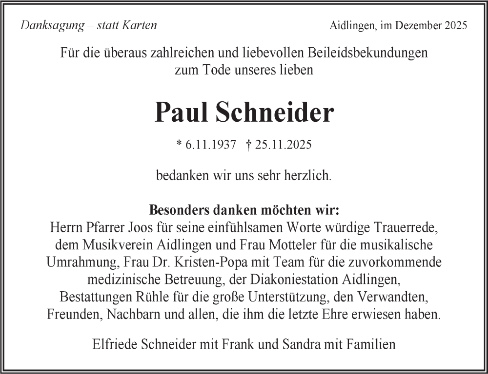 Hier finden Sie alle Traueranzeigen aus der Zeitung, die bisher für Paul Schneider erschienen sind. Weitere Traueranzeigen, die in der Zeitung erscheinen, werden hier ebenfalls aufgelistet