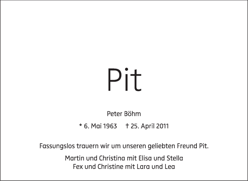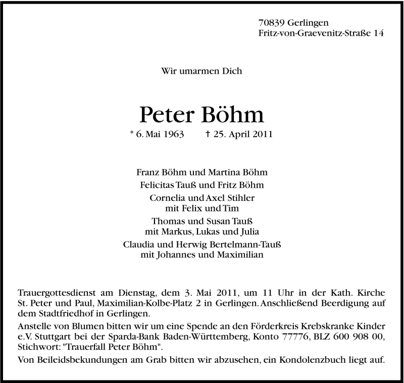 Hier finden Sie alle Traueranzeigen aus der Zeitung, die bisher für Peter Böhm erschienen sind. Weitere Traueranzeigen, die in der Zeitung erscheinen, werden hier ebenfalls aufgelistet