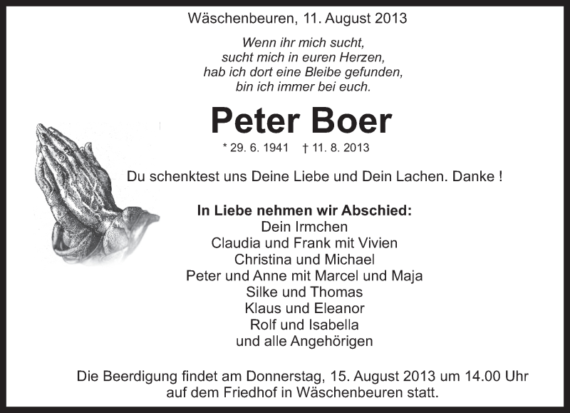 Hier finden Sie alle Traueranzeigen aus der Zeitung, die bisher für Peter Boer erschienen sind. Weitere Traueranzeigen, die in der Zeitung erscheinen, werden hier ebenfalls aufgelistet