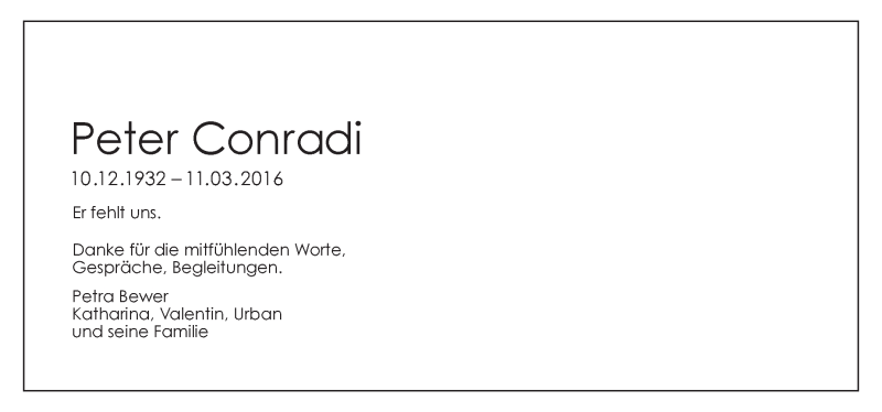 Hier finden Sie alle Traueranzeigen aus der Zeitung, die bisher für Peter Conradi erschienen sind. Weitere Traueranzeigen, die in der Zeitung erscheinen, werden hier ebenfalls aufgelistet