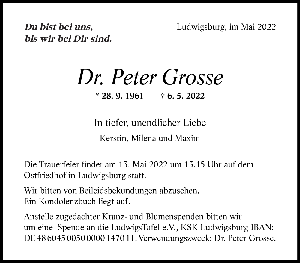 Hier finden Sie alle Traueranzeigen aus der Zeitung, die bisher für Peter Grosse erschienen sind. Weitere Traueranzeigen, die in der Zeitung erscheinen, werden hier ebenfalls aufgelistet
