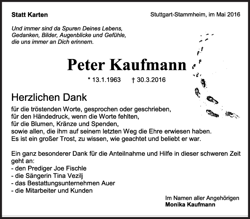 Hier finden Sie alle Traueranzeigen aus der Zeitung, die bisher für Peter Kaufmann erschienen sind. Weitere Traueranzeigen, die in der Zeitung erscheinen, werden hier ebenfalls aufgelistet