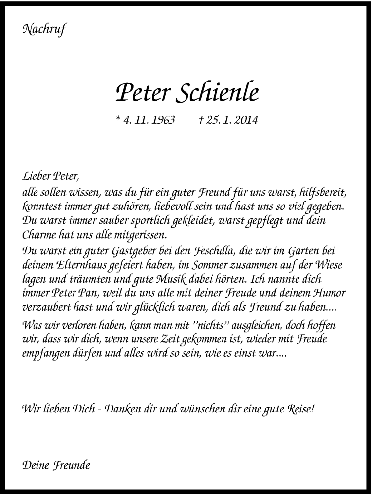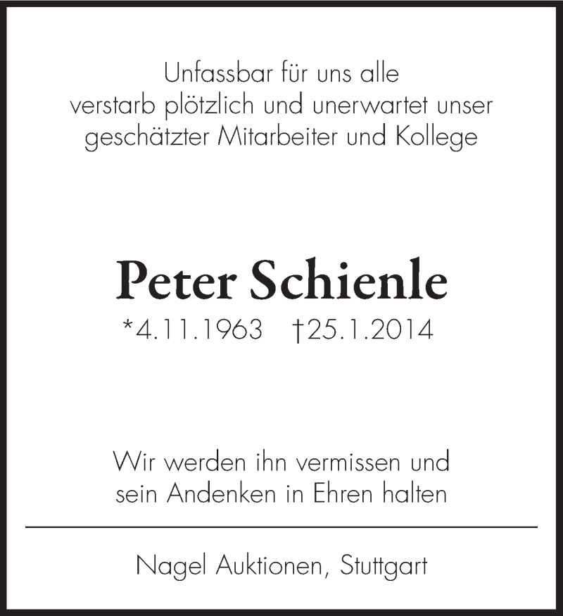 Hier finden Sie alle Traueranzeigen aus der Zeitung, die bisher für Peter Hugo Schienle erschienen sind. Weitere Traueranzeigen, die in der Zeitung erscheinen, werden hier ebenfalls aufgelistet