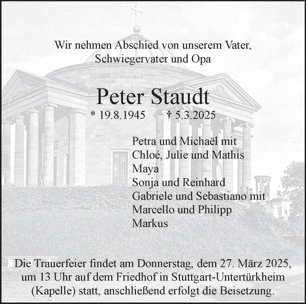 Hier finden Sie alle Traueranzeigen aus der Zeitung, die bisher für Peter Staudt erschienen sind. Weitere Traueranzeigen, die in der Zeitung erscheinen, werden hier ebenfalls aufgelistet