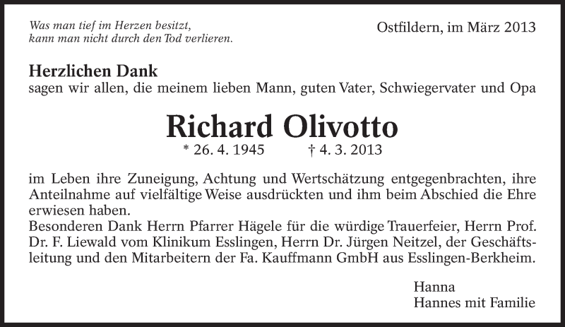 Hier finden Sie alle Traueranzeigen aus der Zeitung, die bisher für Richard Olivotto erschienen sind. Weitere Traueranzeigen, die in der Zeitung erscheinen, werden hier ebenfalls aufgelistet