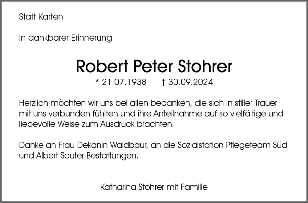 Hier finden Sie alle Traueranzeigen aus der Zeitung, die bisher für Robert Peter Stohrer erschienen sind. Weitere Traueranzeigen, die in der Zeitung erscheinen, werden hier ebenfalls aufgelistet