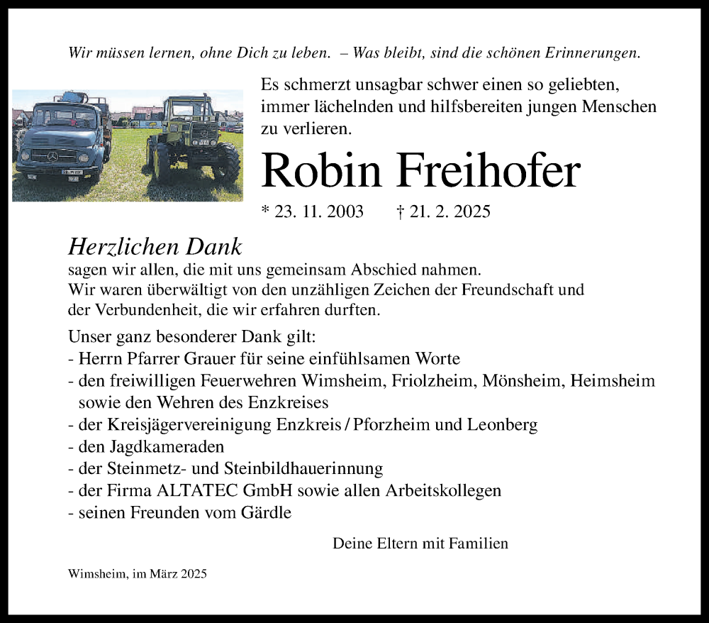 Hier finden Sie alle Traueranzeigen aus der Zeitung, die bisher für Robin Freihofer erschienen sind. Weitere Traueranzeigen, die in der Zeitung erscheinen, werden hier ebenfalls aufgelistet