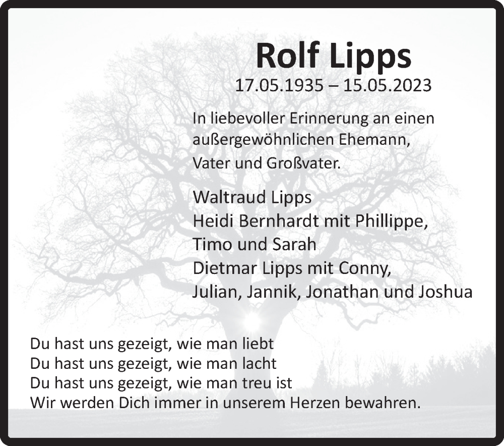 Hier finden Sie alle Traueranzeigen aus der Zeitung, die bisher für Rolf Lipps erschienen sind. Weitere Traueranzeigen, die in der Zeitung erscheinen, werden hier ebenfalls aufgelistet