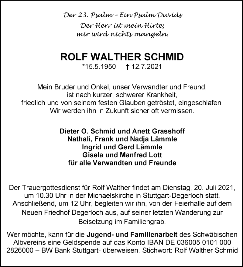 Hier finden Sie alle Traueranzeigen aus der Zeitung, die bisher für Rolf Walther Schmid erschienen sind. Weitere Traueranzeigen, die in der Zeitung erscheinen, werden hier ebenfalls aufgelistet