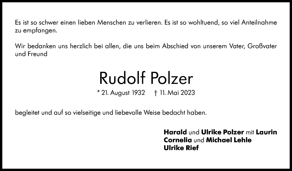 Hier finden Sie alle Traueranzeigen aus der Zeitung, die bisher für Rudolf Polzer erschienen sind. Weitere Traueranzeigen, die in der Zeitung erscheinen, werden hier ebenfalls aufgelistet