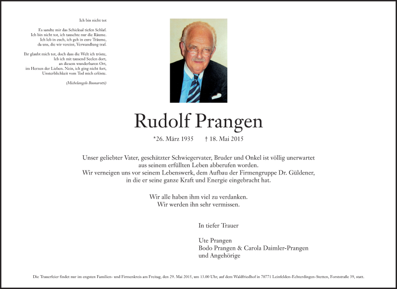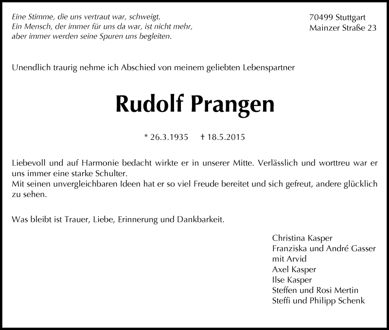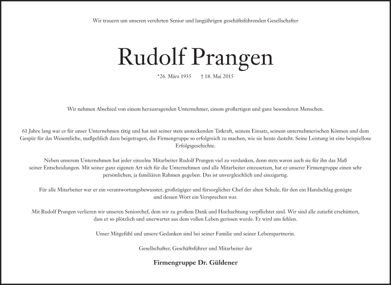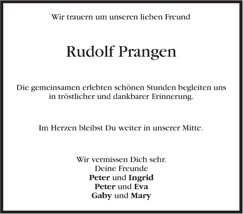 Hier finden Sie alle Traueranzeigen aus der Zeitung, die bisher für Rudolf Prangen erschienen sind. Weitere Traueranzeigen, die in der Zeitung erscheinen, werden hier ebenfalls aufgelistet