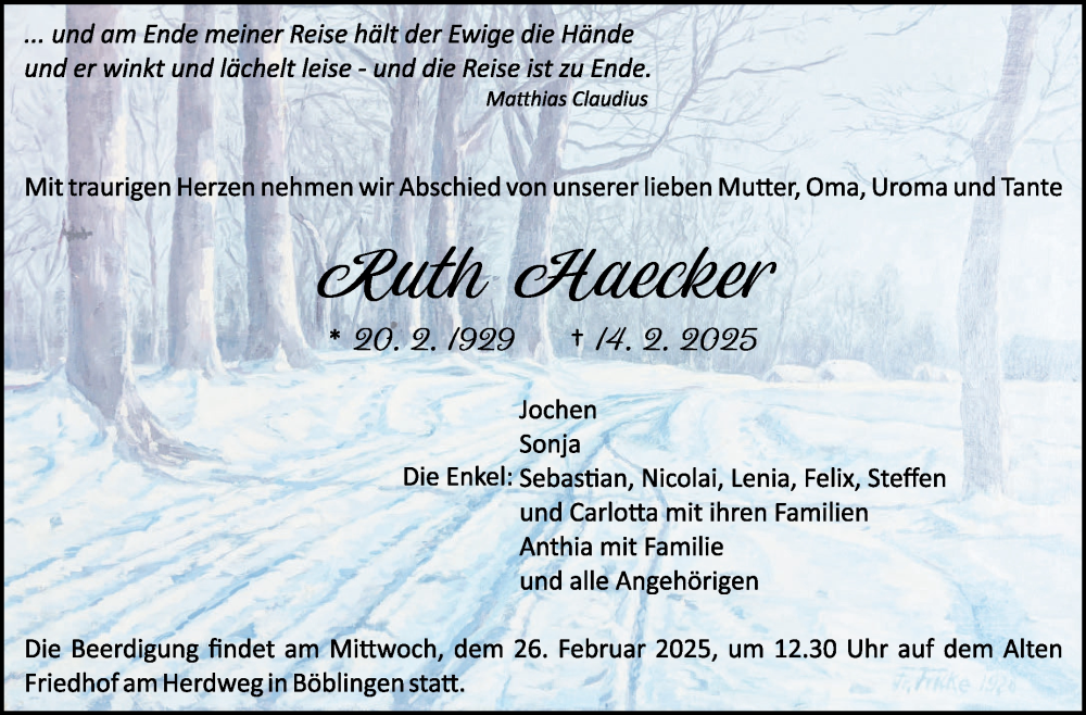 Hier finden Sie alle Traueranzeigen aus der Zeitung, die bisher für Ruth Haecker erschienen sind. Weitere Traueranzeigen, die in der Zeitung erscheinen, werden hier ebenfalls aufgelistet