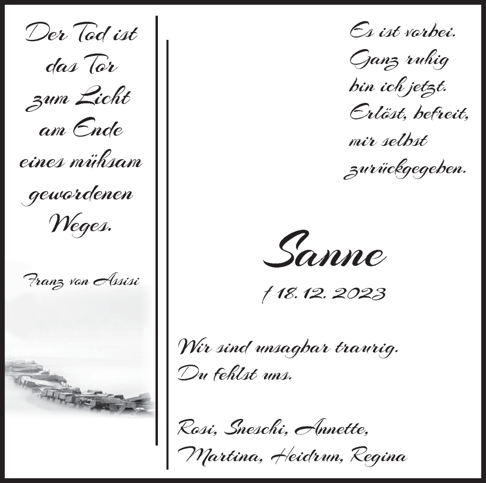 Hier finden Sie alle Traueranzeigen aus der Zeitung, die bisher für Sanne erschienen sind. Weitere Traueranzeigen, die in der Zeitung erscheinen, werden hier ebenfalls aufgelistet